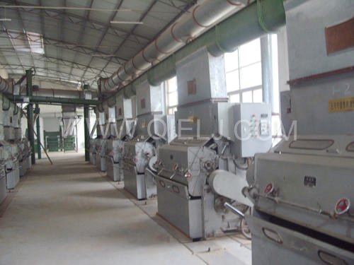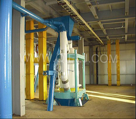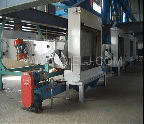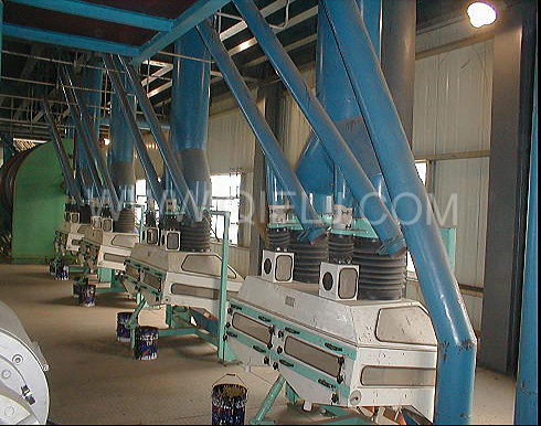 清理工序:采用磁选器去除铁杂;振动清理筛去除大杂、秸秆等;比重去石机去除石子和砖块等重杂;除尘系统采用单联刹克龙以及离心风机进行有效的除尘,以保证车间卫生和清理轻杂。